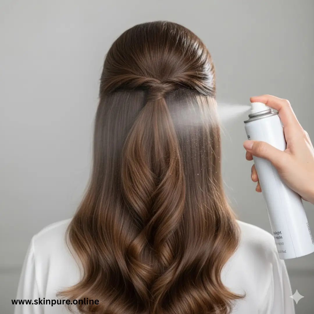 To have clean roots keep your half-up half-down fresh all day. To keep the hair on the crown, spray a small amount of dry shampoo then style.